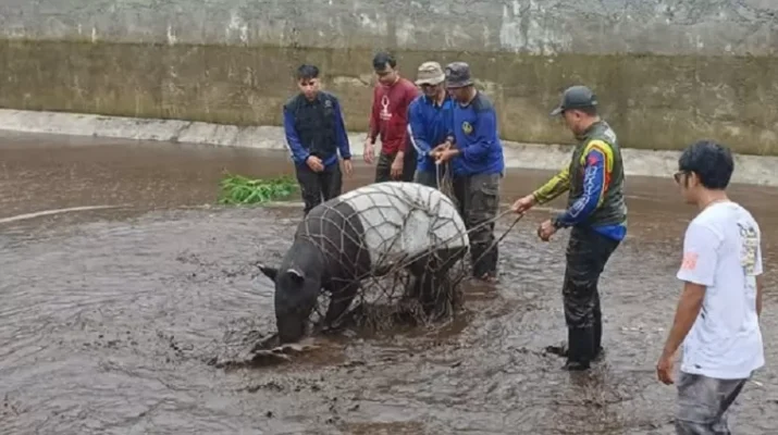 SIMPANG AMPEK – Balai Konservasi Sumber Daya Alam (BKSDA) Sumatera Barat Wilayah I Pasaman mengevakuasi tapir yang masuk ke dalam kolam Balai Benih Ikan